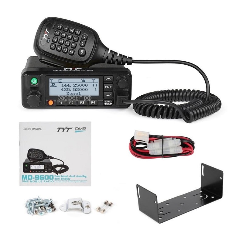 Рация - 1шт, Тангента - 1шт, Крепление тангенты - 1шт, Кабель питания - 1шт, Скоба крепежная - 1шт, Набор винтов - 1шт, Инструкция на английском языке - 1шт |
