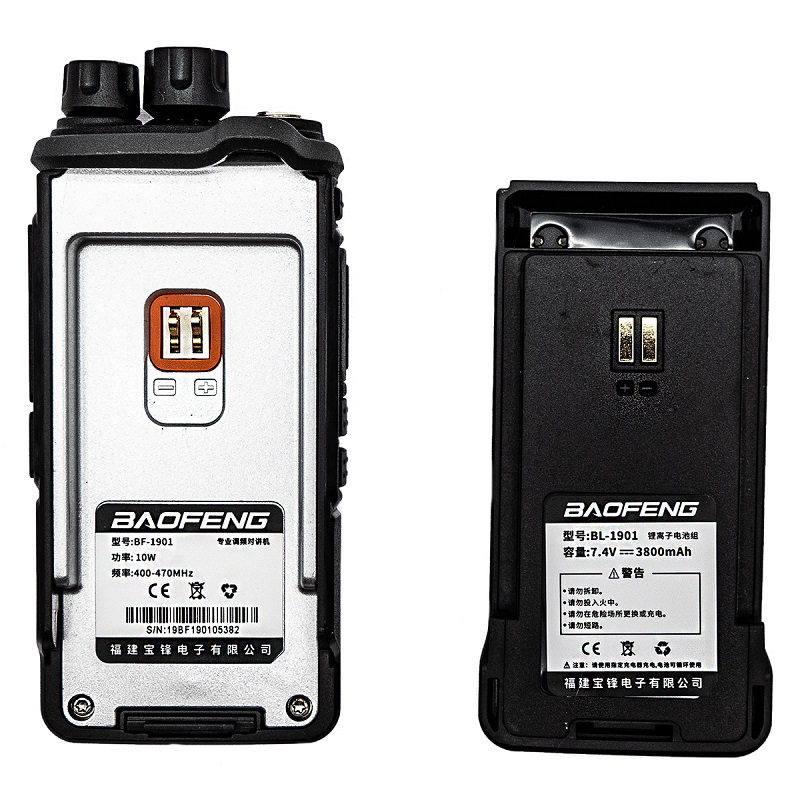 Портативная рация Baofeng BF-1901, с гарнитурой. Baofeng BF-1901 — новейшая модель радиостанции диапазона UHF 400–470 МГц. Отличается прочным корпусом и аккумулятором повышенной ёмкости 3800 мАч с рабочим напряжением 7,4 В.
