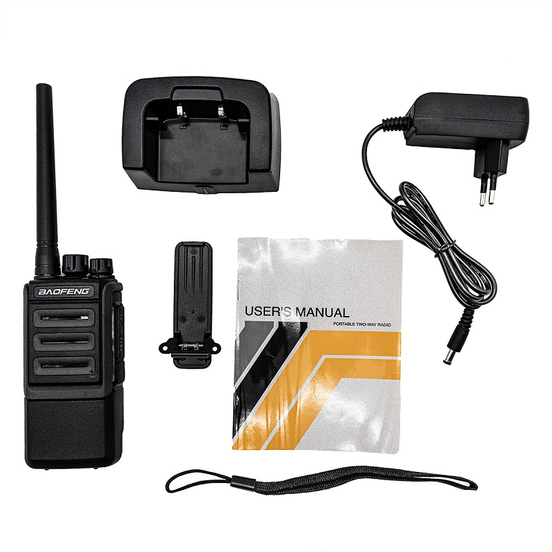 Рация - 1шт, Гарнитура - 1шт, Антенна - 1шт, Аккумулятор - 1шт, Зарядное устройство - 1шт, Ремешок - 1шт, Клипса на пояс - 1шт, Инструкция на английском языке - 1шт |
