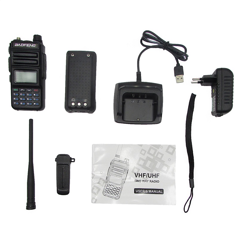 Рация - 1шт, Антенна - 1шт, Аккумулятор - 1шт, Зарядное устройство - 1шт, Ремешок - 1шт, Клипса на пояс - 1шт, Инструкция на английском языке - 1шт. |