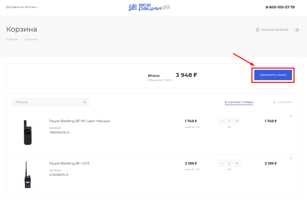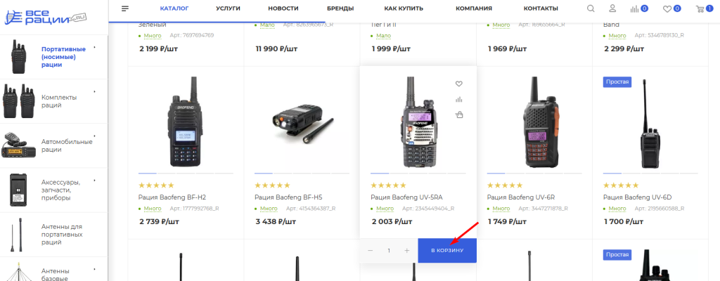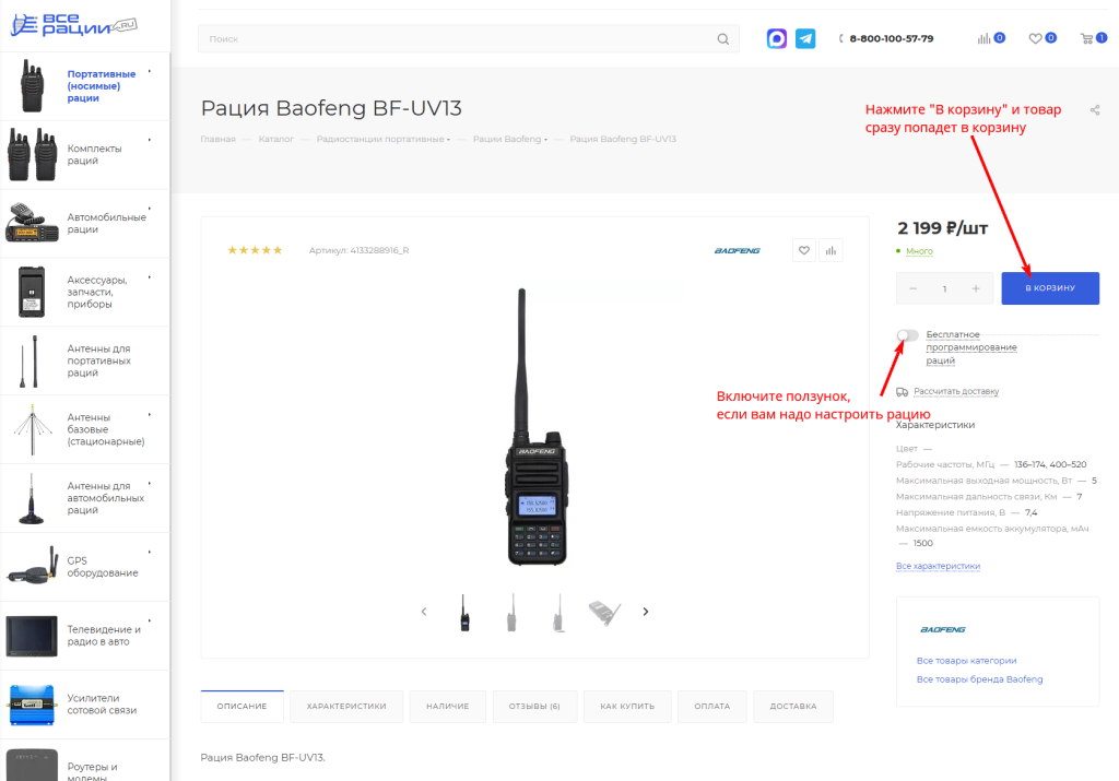 Либо зайти в карточку товара, нажав на изображение, и уже в карточке товара нажать “В корзину”. Также, вы можете нажать на ползунок “Бесплатное программирование раций” если вам нужно настроить рацию сразу.