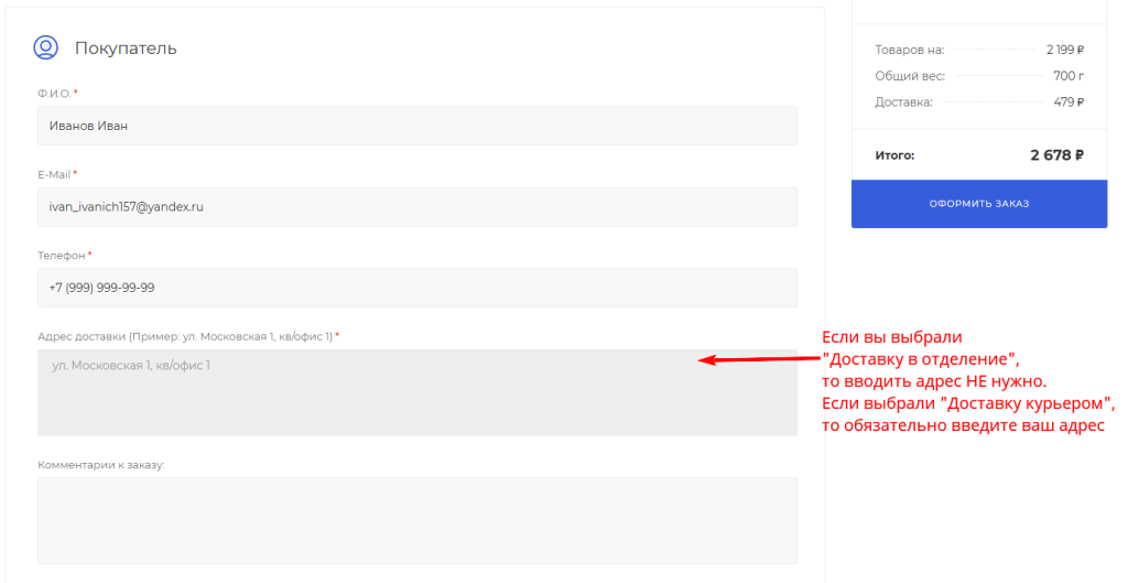 Введите данные о себе: ФИО, адрес доставки, номер телефона. В поле «Комментарии к заказу» введите сведения, которые могут пригодиться магазину для подготовки отправки заказа.