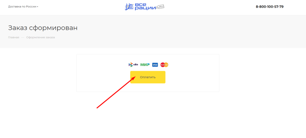 Далее, чтобы заказ приняли в работу и передали в доставку, нужно его оплатить. Для этого нажмите на кнопку “Оплатить” и для вас откроется страница оплаты: