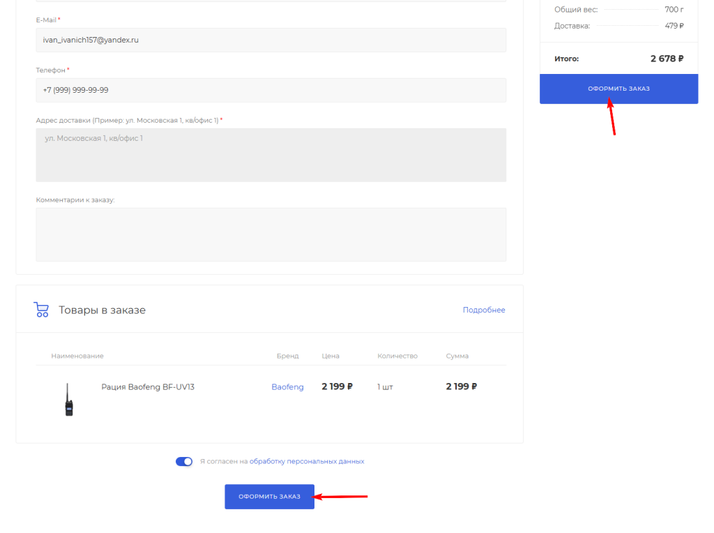 После того, как все данные заполнены, нажмите кнопку “Оформить заказ” на боковой панели или внизу страницы: