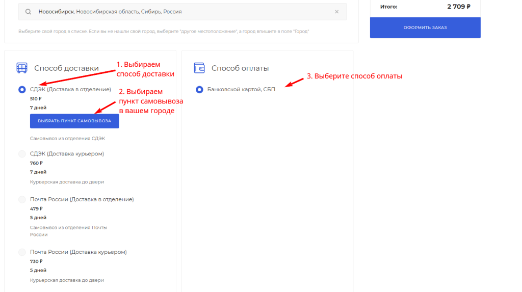Далее: 1) выберите необходимый способ доставки. Если вы выбрали вариант “Доставка в отделение”, то далее обязательно 2) выберите конкретный пункт выдачи заказов в вашем городе. 3) далее выберите способ оплаты и переходите к заполнению полей ниже.
