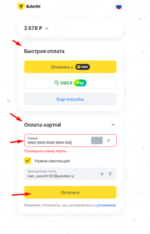 Далее, чтобы оплатить товар, выберите удобный способ оплаты: быстрая оплата через СБП или оплата картой. Для оплаты картой введите номер карты и нажмите “Оплатить”. (E-mail подтянется автоматически из информации о заказе).