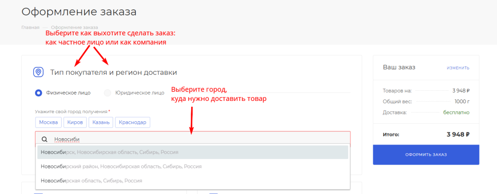 Выберите как вы хотите сделать заказ, как физ. лицо или как компания. Далее выберите ваш город из предложенных или введите город в строку поиска. При вводе названия города появятся подсказки из которых можно выбрать нужный вариант.